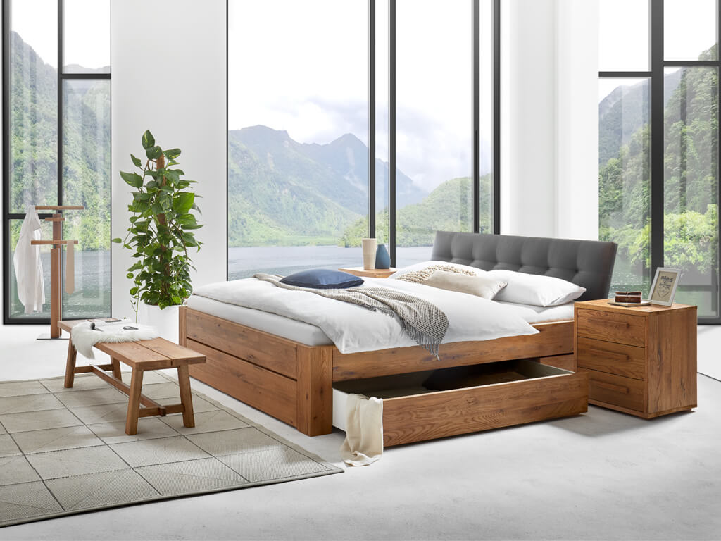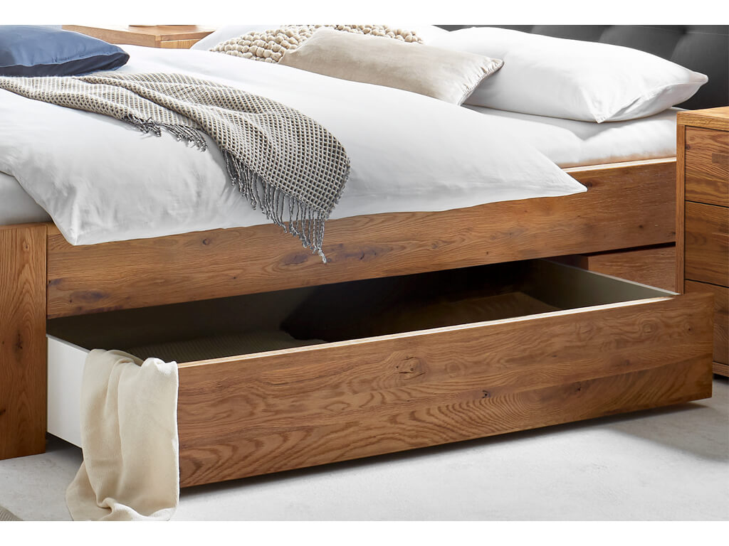 Produktinformationen "Hasena - Function Stauraumbett Cassone | Massivholz Wildeiche natur, gebürstet, geölt | Polsterkopfteil Ronna | verschiedene Größen & Farben konfigurierbar"Hasena - Function Stauraumbett Cassone | Massivholz Wildeiche natur, gebürstet, geölt | Polsterkopfteil Ronna | verschiedene Größen & Farben konfigurierbar | Überlänge | BettkästenDas Stauraumbett Cassone bietet luxuriöses, massives Holz-Design und ein hochwertiges Polsterkopfteil. Die integrierten Schubladen nutzen den Platz optimal aus. Maximale Ästhetik, mühelose Ordnung. Konfigurieren Sie jetzt Ihr Traumbett und lassen Sie es sich kostenlos nachhause liefern!