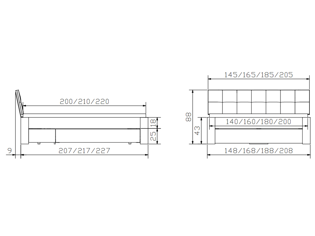 | Liegefläche: | 140 x 200 cm, 140 x 210 cm, 140 x 220 cm, 160 x 200 cm, 160 x 210 cm, 160 x 220 cm, 180 x 200 cm, 180 x 210 cm , 180 x 220 cm, 200 x 200 cm , 200 x 210 cm , 200 x 220 cm |