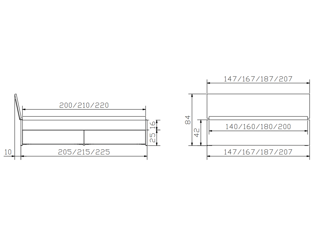 | Liegefläche: | 140 x 200 cm, 140 x 210 cm, 140 x 220 cm, 160 x 200 cm, 160 x 210 cm, 160 x 220 cm, 180 x 200 cm, 180 x 210 cm , 180 x 220 cm, 200 x 200 cm , 200 x 210 cm , 200 x 220 cm |