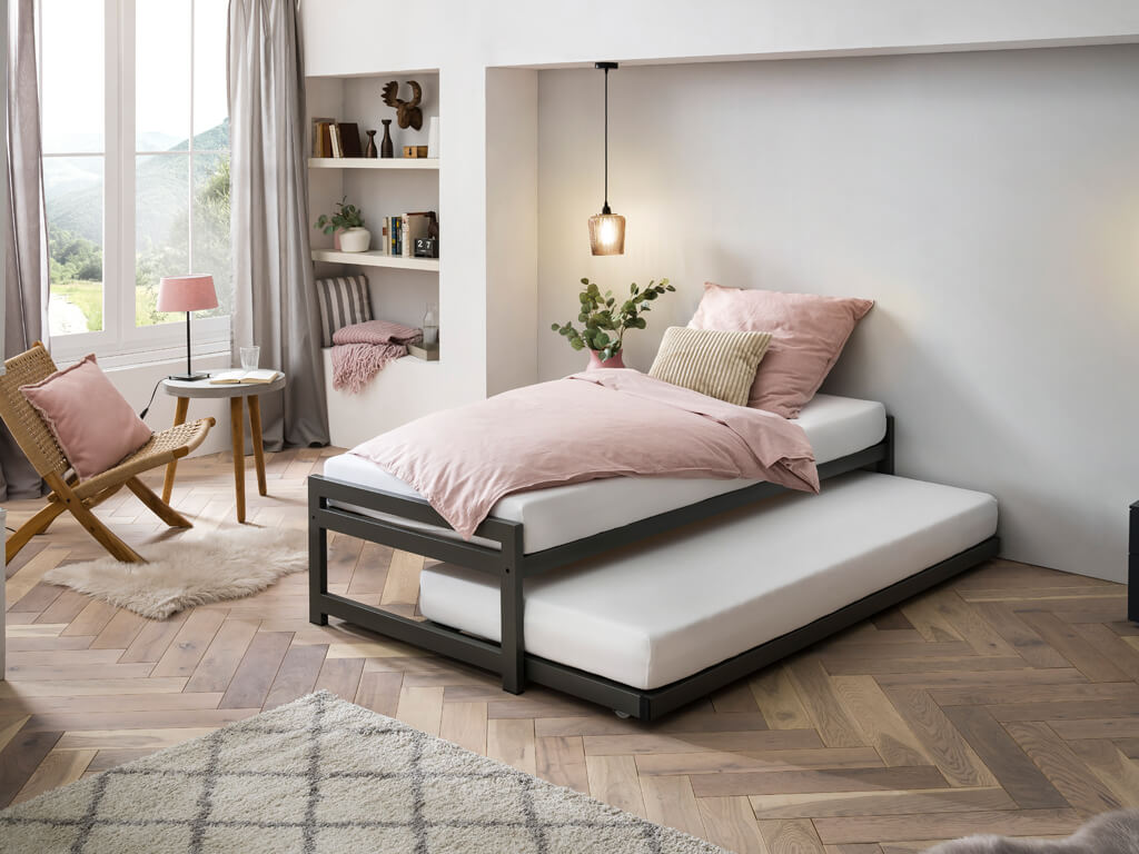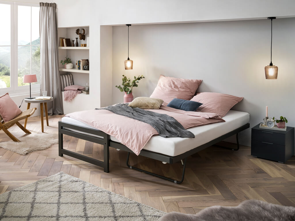 Ein Bett, drei Möglichkeiten. Tagsüber platzsparendes Einzelbett, nachts komfortables Doppelbett. Das Ausziehbett Monument bietet eine zweite vollwertige Schlafgelegenheit auf Rollen und zum hochklappen. Komfortabel, stabil und schnell einsatzbereit. Kostenfreie Lieferung in Deutschland!