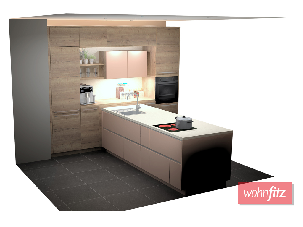 Front: 382 STRUCTURA 402 Eiche Havanna Nachbildung, 357 SENSO 492 Lack Koralle Premium matt