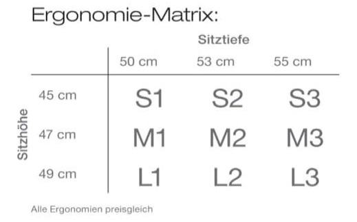 Sitztiefe / Sitzhöhe in cm: je nach Ergonomie - Sitzhöhe: 45/47/49 / Sitztiefe: 50/53/55