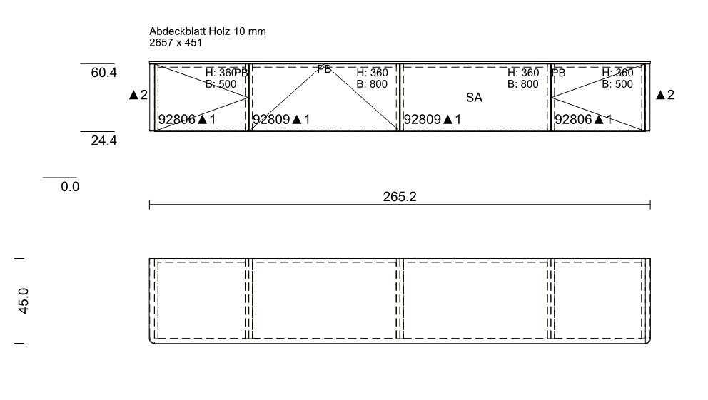 Breite: 265,2 cm; Höhe: 36,0 cm; Tiefe: 45,0 cm