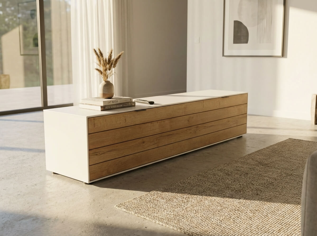Wöstmann integriert moderne Technik für hohen Komfort. Dazu gehören oft Soft-Close-Beschläge für Türen und Schubladen, Push-to-Open-Mechanismen, Kabelmanagement-Lösungen in Lowboards sowie die Integration von LED-Beleuchtung zur stimmungsvollen Inszenierung der Möbel und Dekoration.