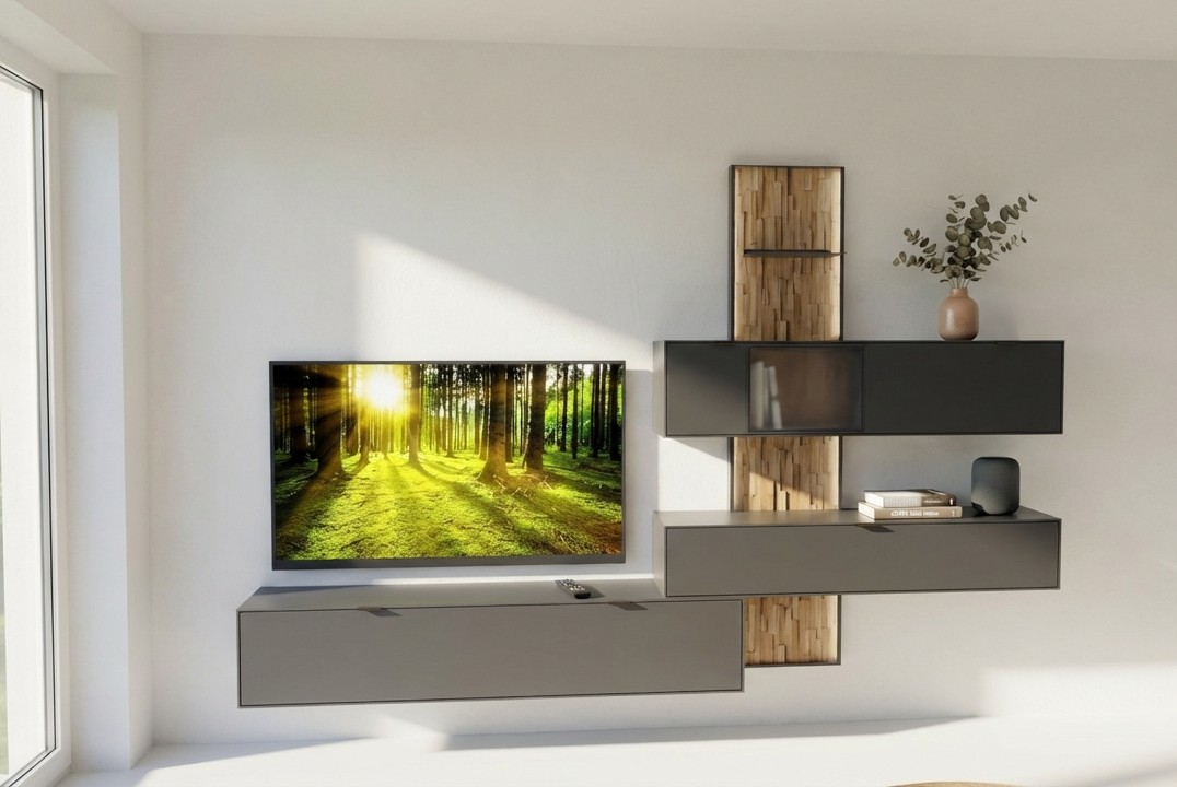 Wöstmann WM 2470 - Wohnwand inkl. Beleuchtung | Lack graphitgrau/Spaltholzakzent | B: 303,8 cm
