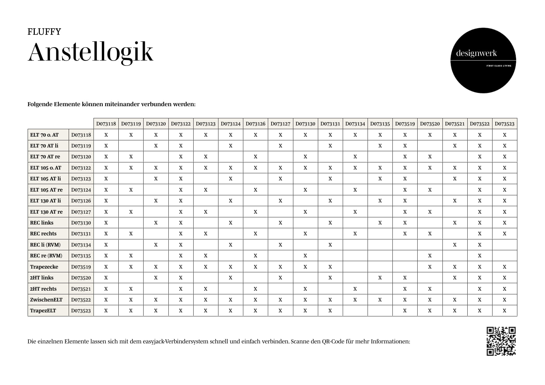Fluffy besteht aus verschiedenen Einzelelementen, die sich unterschiedlich miteinander kombinieren lassen. Ihrer Fantasie sind keine Grenzen gesetzt! Dank des neuen Verbinder-System „easyjack“ lassen sich die einzelnen Elemente ganz einfach ohne Werkzeug und ohne Hilfsperson jederzeit neu arrangieren.