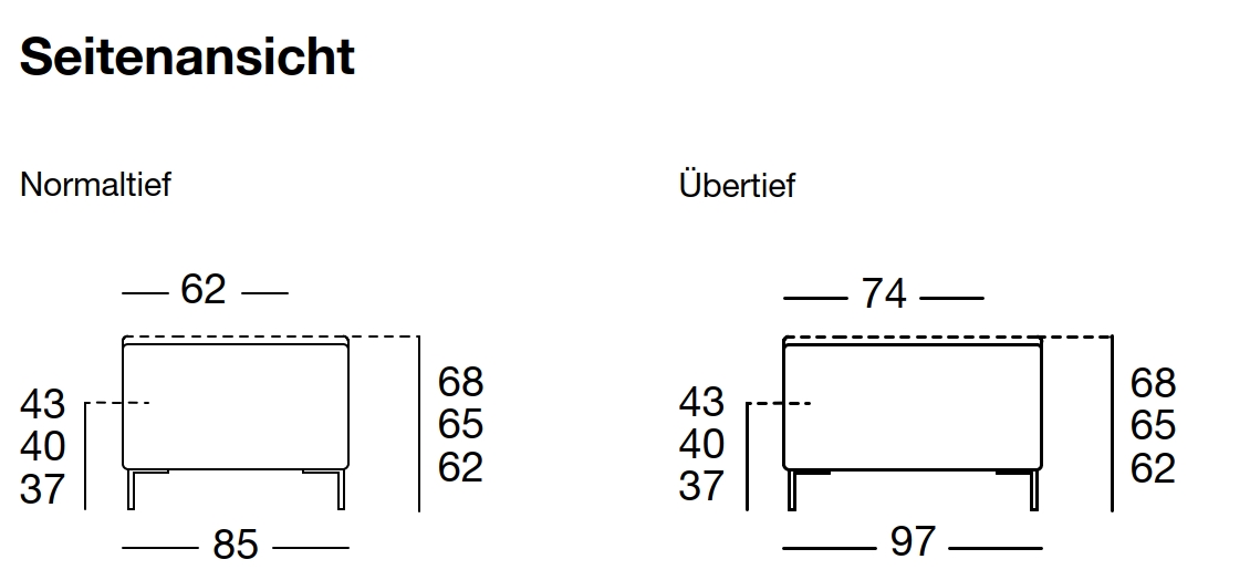 - Bei Gruppierungen mit unterschiedlichen Sitztiefen wird sich im Laufe der Zeit das Sitzgefühl infolge der Benützung unterschiedlich entwickeln: geringere Sitztiefe – bleibt fester; mehr Sitztiefe – wird weicher.