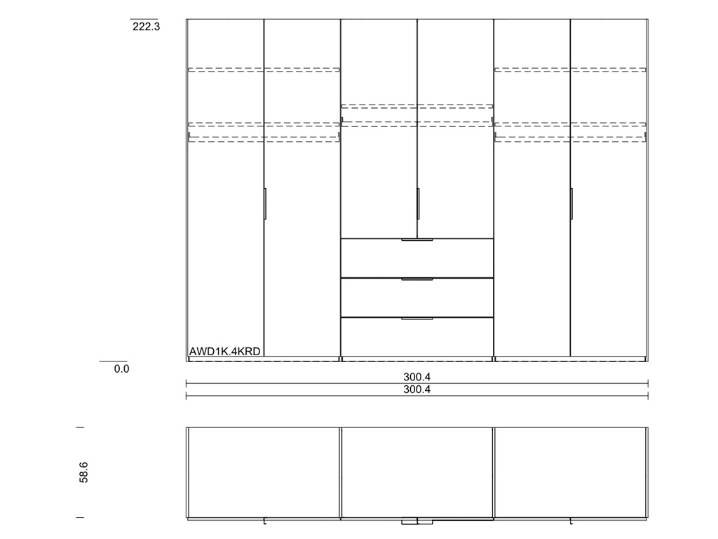 Maße: Breite: 300,0 cm, Höhe: 223,0 cm, Tiefe: 60,0 cm- 6-türig, 3 Schubkästen, 6 Fachböden und 3 Kleiderstangen