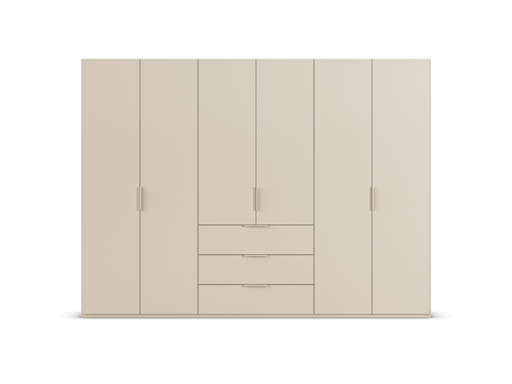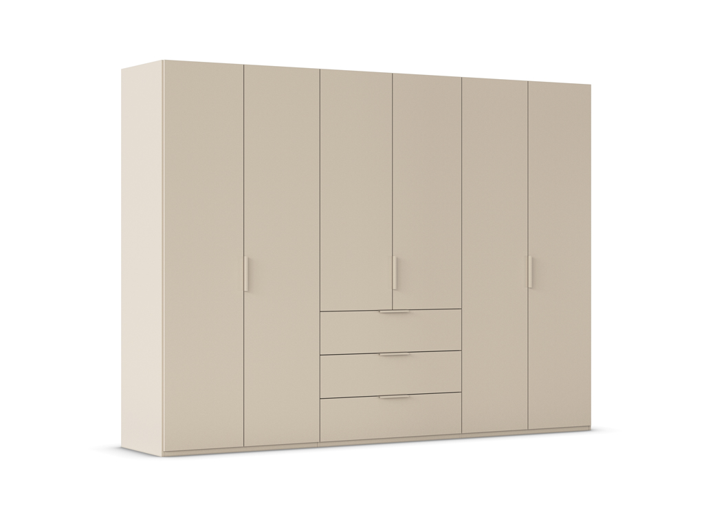 Dieser moderne Drehtürenschrank der Serie Rauch Black Scaletta Spin besticht durch sein minimalistisches Design in einem eleganten, matten Beigeton. Dank der großzügigen Aufteilung mit sechs Türen und drei praktischen Schubladen bietet er maximalen Stauraum für eine strukturierte Garderobe. Die schlichte Linienführung und die dezenten Griffe fügen sich dabei harmonisch in jedes zeitgemäße Schlafzimmer-Ambiente ein.