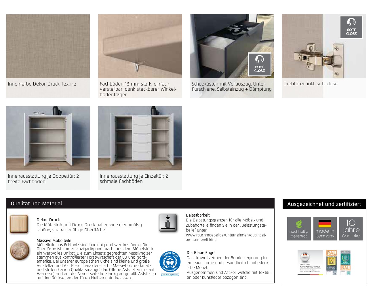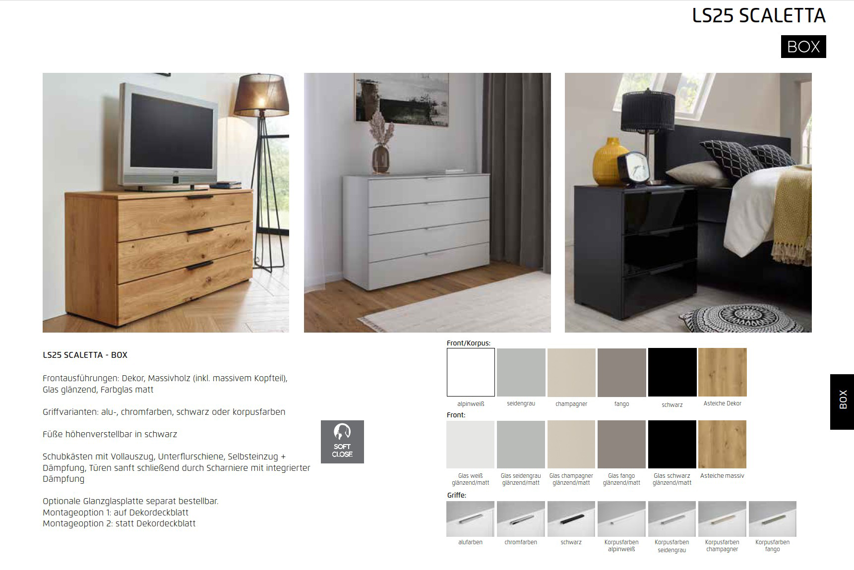 - Korpus: Dekor alpinweiß, seidengrau, champagner, fango, schwarz oder Asteiche